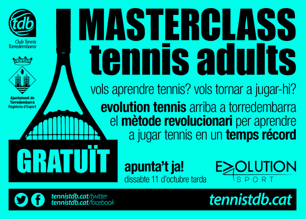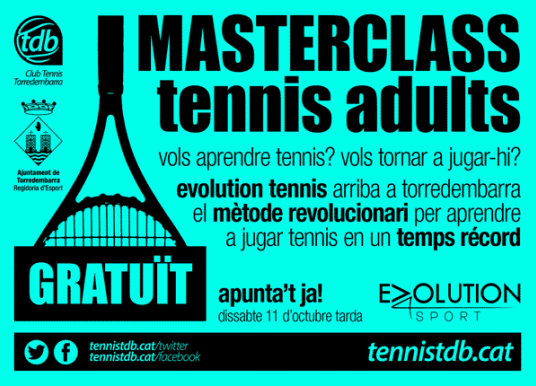 El proper dissabte 11 d'octubre, l'Escola de Tennis ofereix gratuïtament als socis i usuaris del TennisTDB unes Masterclass de Tennis per Adults amb l'objectiu d'iniciar-se o perfeccionar el vostre nivell de tennis.