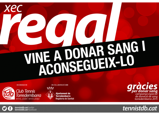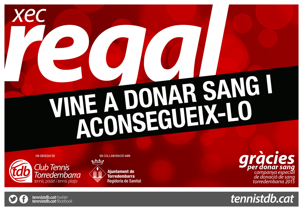 El proper dissabte 21 de març, la Regidoria de Sanitat de l'Ajuntament de Torredembarra i el Banc de Sang i Teixits organitzen una nova Campanya Especial de Donació de Sang a Torredembarra. El Tennis TDB s’hi torna a adherir.