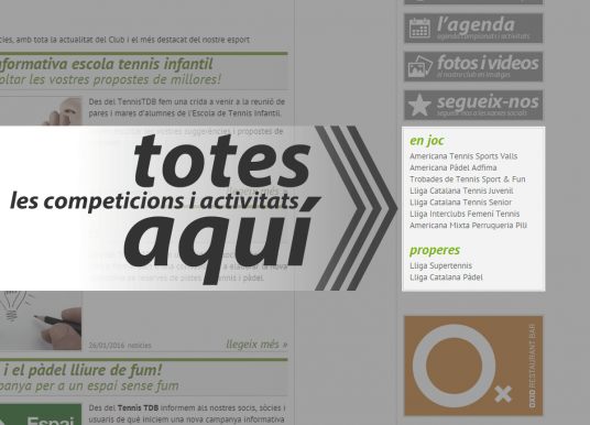 Des del TennisTDB us informem que al nostre lloc web, teniu un menú lateral dret on podreu trobar de seguida les competicions "en joc" o "properes" que siguin del vostre interès.