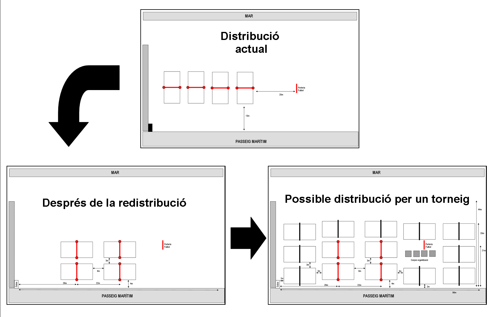 - Distribució més òptima per poder organitzar les activitats i competicions de Tennis Platja, ja que les mateixes pistes amb els pals fixes, podran ser utilitzades per les competicions.